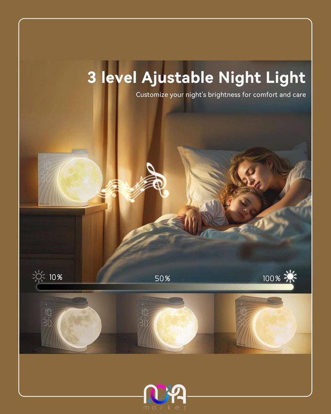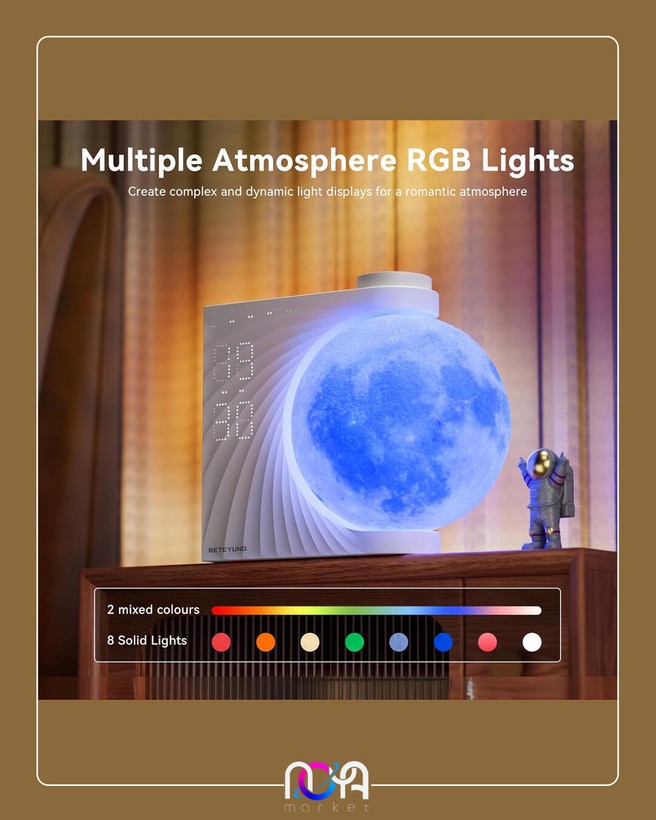 این محصول دارای آپشن های خاصی برای تایم شب و بیدار شدن صبح داره، به عنوان مثال شما میتوانید با استفاده از آپشن چرت زدن، 10 دقیقه زمان بیشتری برای لذت بردن از خواب ببرید و بعد با صدای آرامش بخشی از خواب بیدار شوید یا حتی با غیرفعال کردن صدا، دستگاه نور خود را از 0% تا 100% به تدریج افزایش میدهد تا از طریق روشنایی نور ماه بیدار شوید!