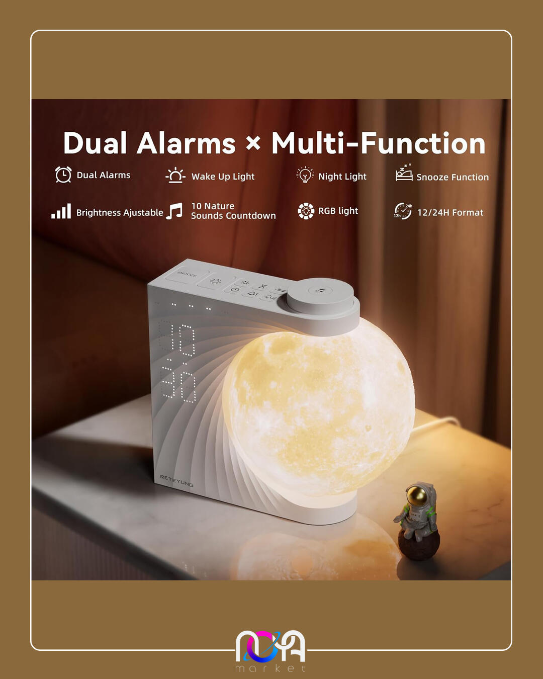 این محصول دارای آپشن های خاصی برای تایم شب و بیدار شدن صبح داره، به عنوان مثال شما میتوانید با استفاده از آپشن چرت زدن، 10 دقیقه زمان بیشتری برای لذت بردن از خواب ببرید و بعد با صدای آرامش بخشی از خواب بیدار شوید یا حتی با غیرفعال کردن صدا، دستگاه نور خود را از 0% تا 100% به تدریج افزایش میدهد تا از طریق روشنایی نور ماه بیدار شوید!