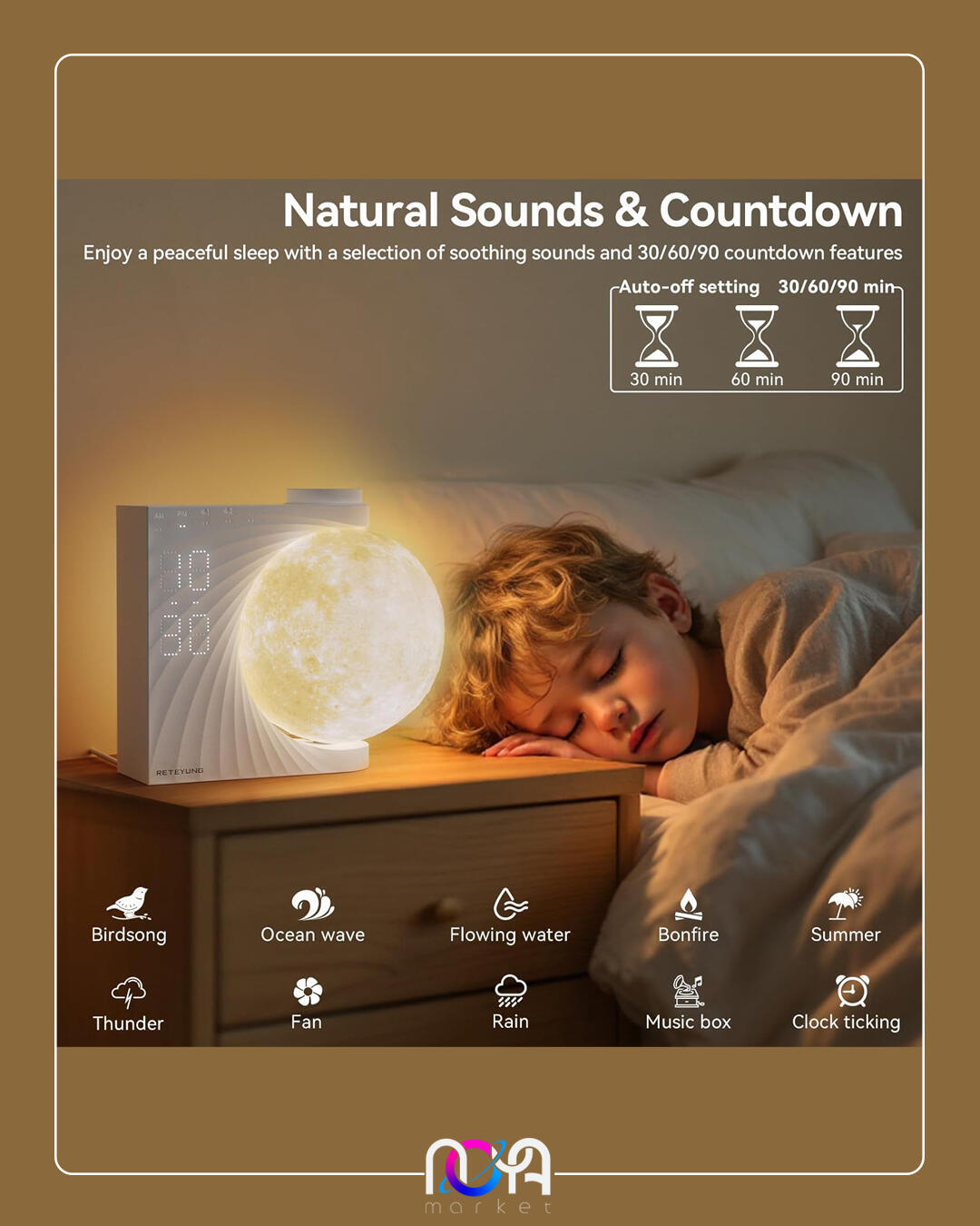 این ساعت 2 آلارم مخصوص با آپشن های بی نظیر و 10 صدای آرامش بخش مثل صدای باران، اقیانوس، پرنده و ... دارد.
