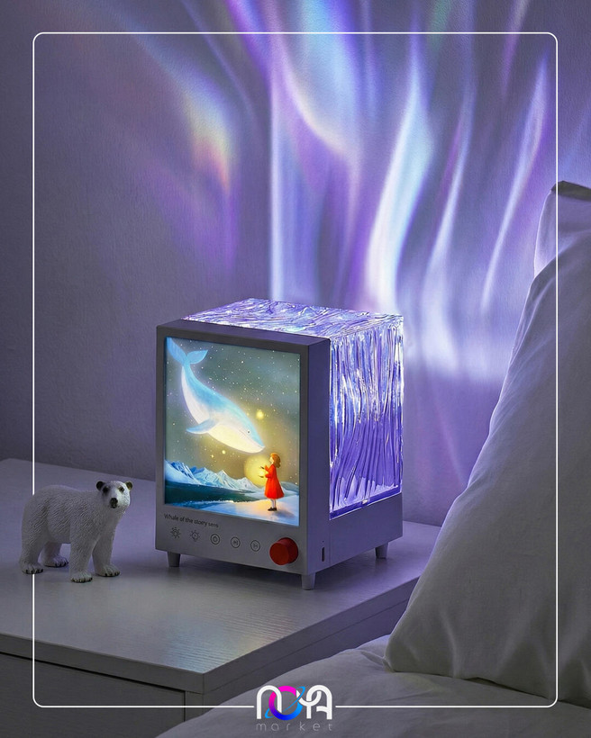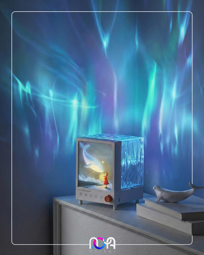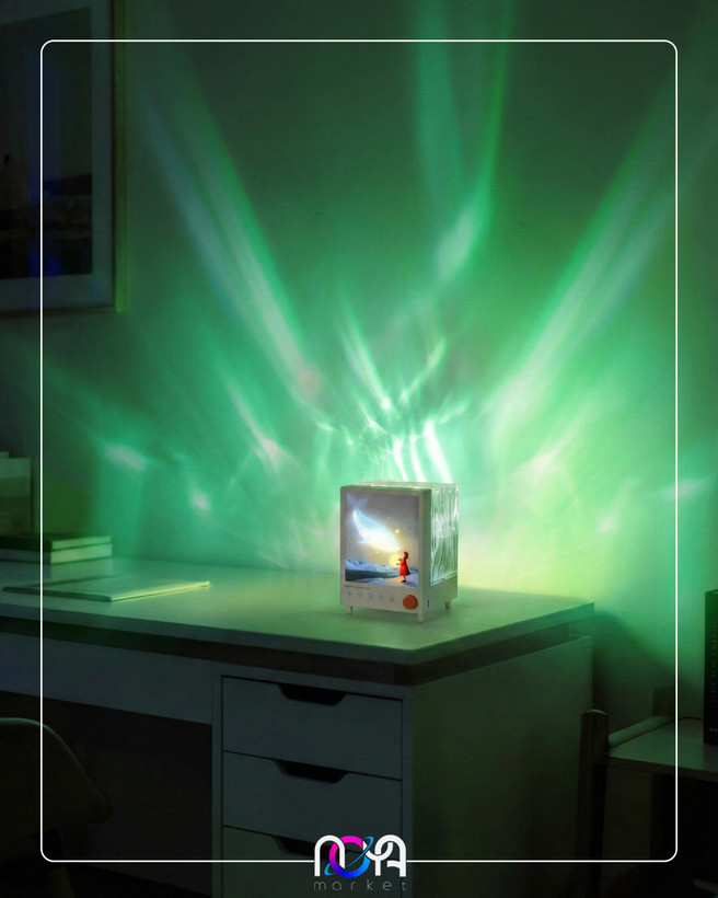 شفق باکس دارای یک تصویر از دخترک فانوس به دست در حال تماشای یک وال هست که روشن میشه و قسمت پشت محصول یک مکعب شفاف طرحداره که نور شفق رو روی دیوار و سقف منعکس میکنه و 7 تا رنگ داره🌌