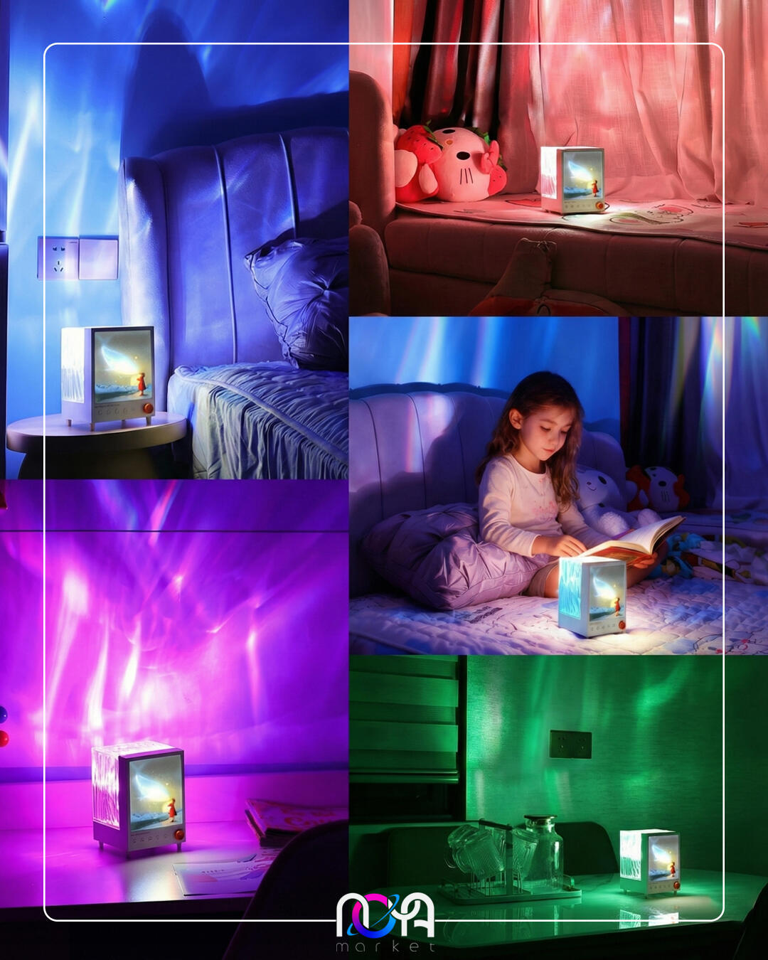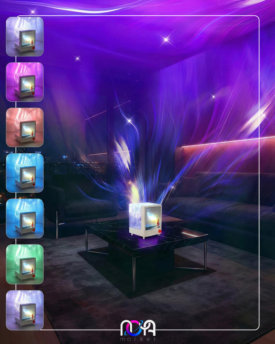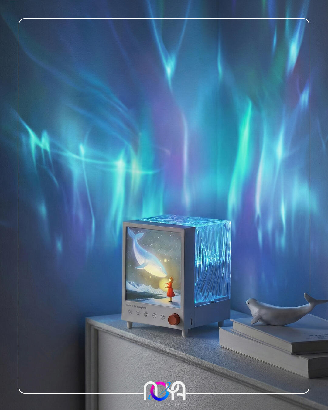 شفق باکس دارای یک تصویر از دخترک فانوس به دست در حال تماشای یک وال هست که روشن میشه و قسمت پشت محصول یک مکعب شفاف طرحداره که نور شفق رو روی دیوار و سقف منعکس میکنه و 7 تا رنگ داره🌌