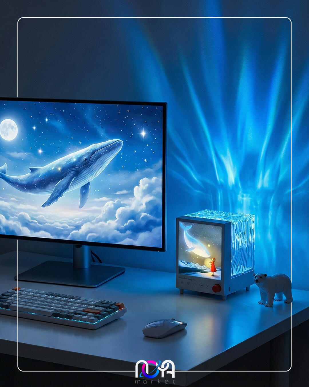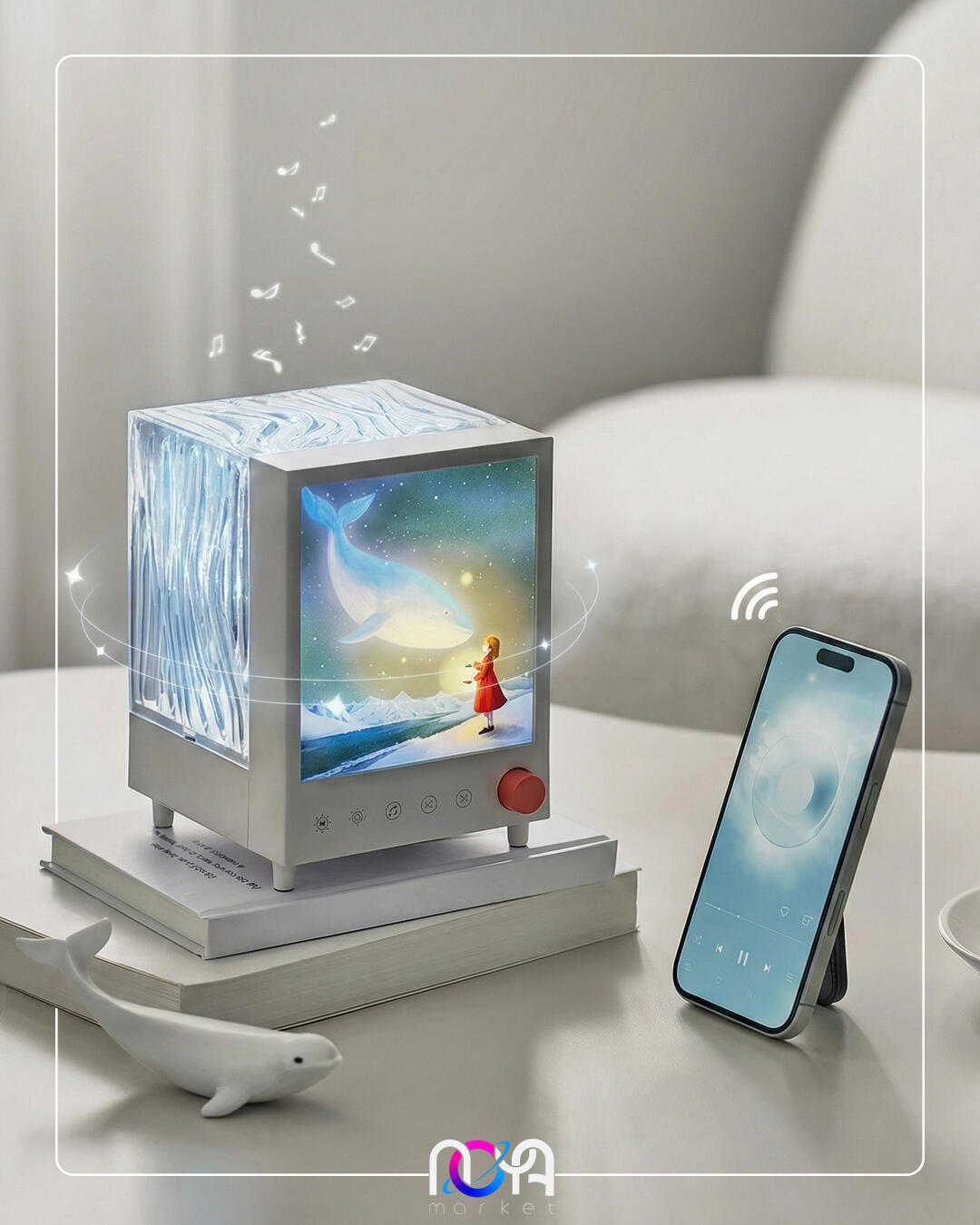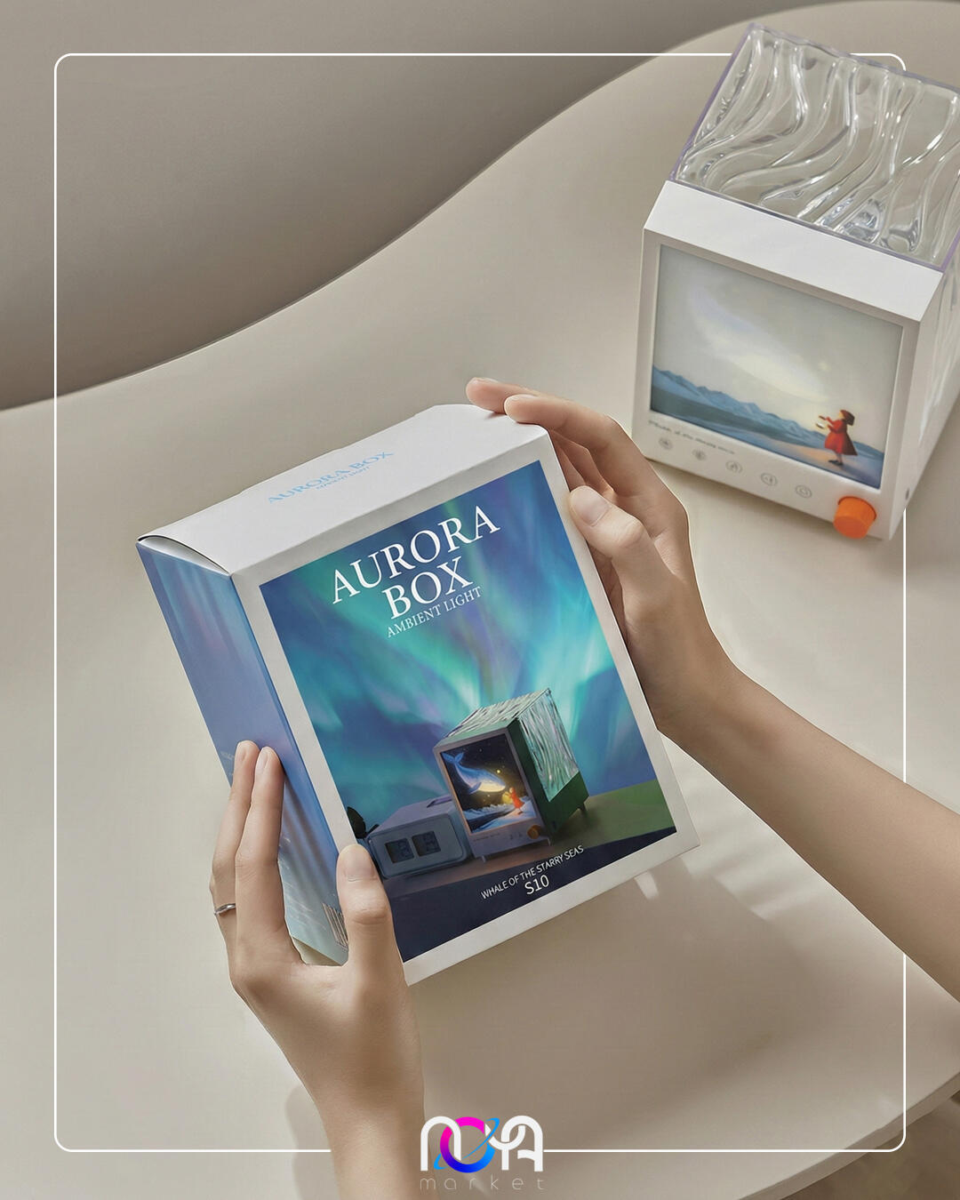 شفق باکس دارای یک تصویر از دخترک فانوس به دست در حال تماشای یک وال هست که روشن میشه و قسمت پشت محصول یک مکعب شفاف طرحداره که نور شفق رو روی دیوار و سقف منعکس میکنه و 7 تا رنگ داره🌌